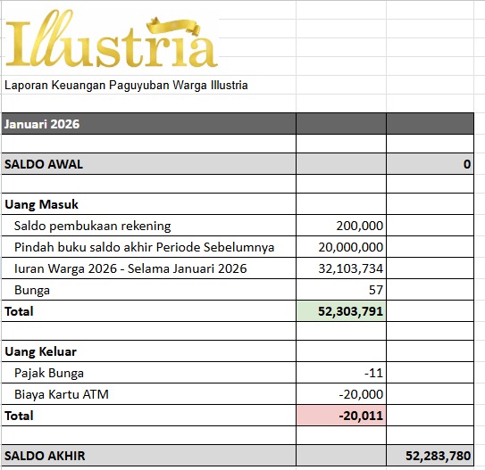 Kami menginformasikan bahwa penerimaan dana Iuran warga pada periode Januari 2026 dari kurang lebih 100 warga mencapai lebih dari 32 Juta Rupiah. Pengumpulan dana masih dibuka sampai saat ini, dan penambahan dana akan dilaporkan lagi di periode selanjutnya.