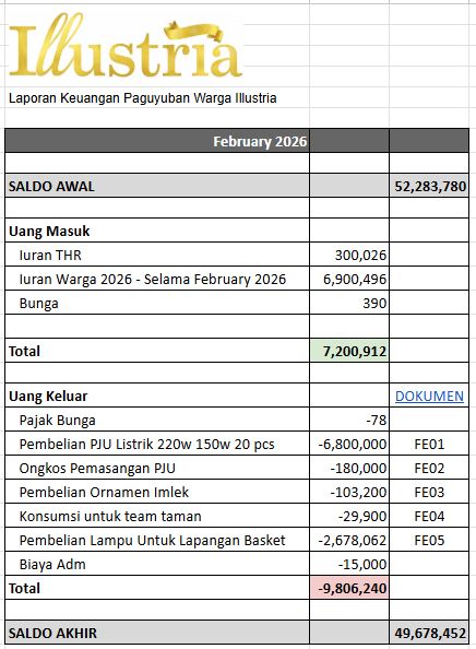 Kami menginformasikan bahwa penerimaan dana Iuran warga pada periode February 2026 dari tambahan 23 warga mencapai 6,9 Juta Rupiah. Pengumpulan dana masih dibuka sampai saat ini, dan penambahan dana akan dilaporkan lagi di periode selanjutnya.